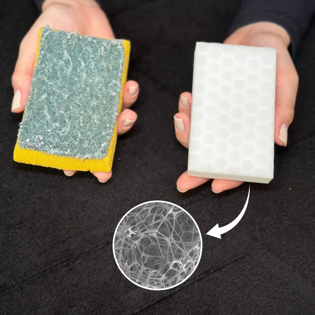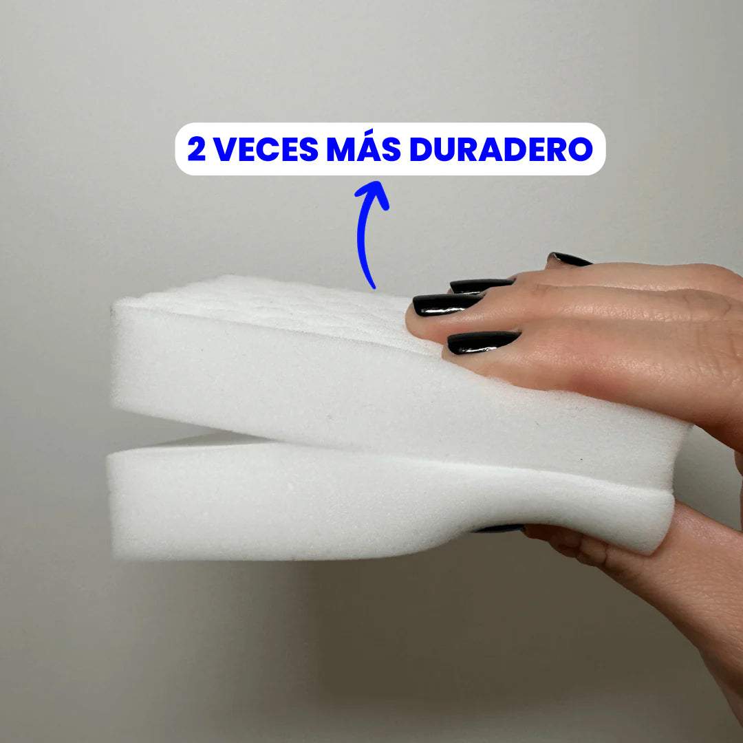 La Esponja está fabricada con espuma de melamina 100% pura y ultraconcentrada, que es un polímero nanotecnológico. Además, está desarrollado con el doble de melamina. Esto hace que su calidad, durabilidad y potencia sean 2 veces mayores en comparación con otras esponjas mágicas del mercado.