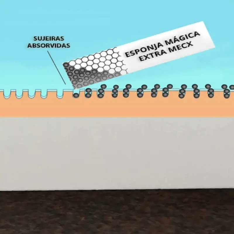 La Esponja Mágica Extra Mecx es como una goma de borrar, pero hecha con espuma de melamina. Cuando se moja en agua, esta sustancia especial activa las micro lavadoras que entran en contacto con la suciedad adherida a las superficies, absorbiéndolas en su interior y limpiando todo fácilmente. Por lo tanto, se la conoce popularmente como la esponja "mágica" porque la esponja común no limpia la suciedad de manera tan eficiente y rápida.
