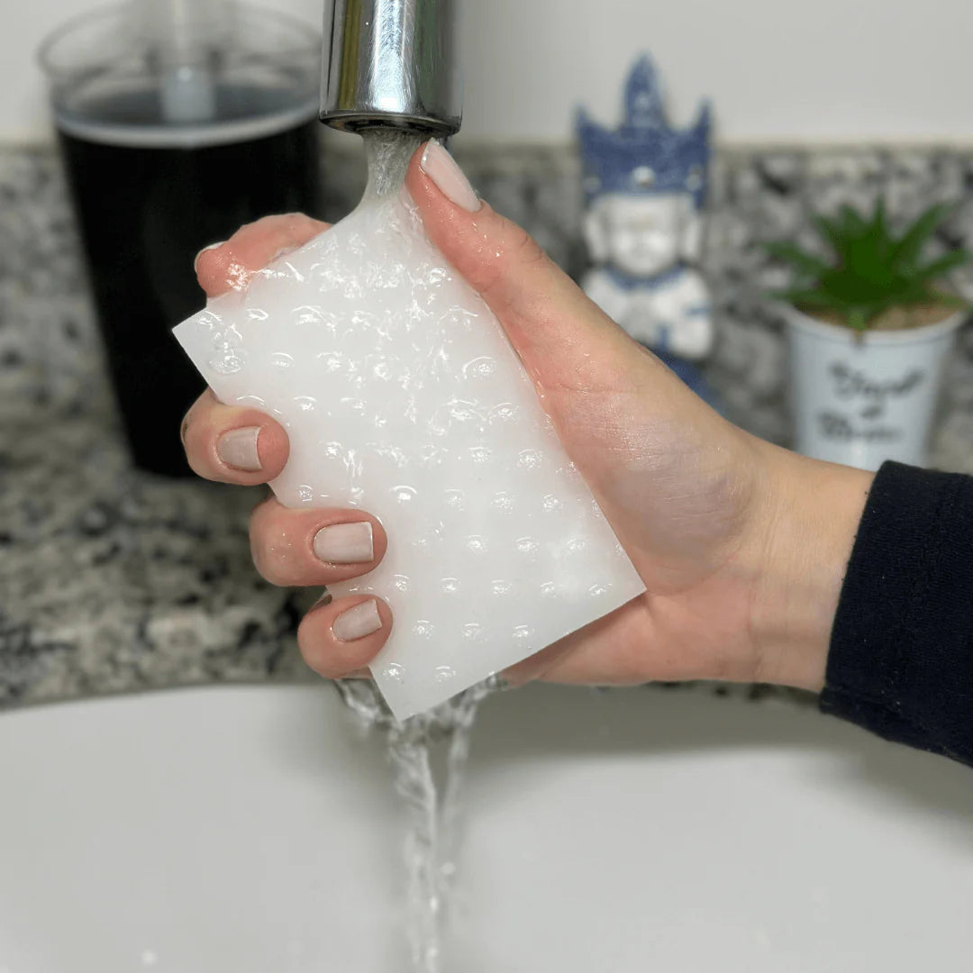 La Esponja es como una goma de borrar, pero hecha con espuma de melamina. Cuando se moja en el agua, se activan las micro arandelas actuando como si de una goma de borrar se tratara. Después de cada exfoliación, la suciedad adherida a las superficies se elimina y se absorbe muy fácilmente en la esponja.